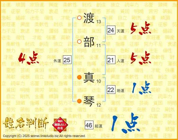 生活面を象徴する運勢です。外部から受ける影響力を表し、結婚運、家庭運や職場、環境への順応性を表します。総運から人運を引いた画数。姓や名が1文字の場合を除く。