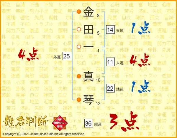 金(8画)田(5画)一(1画) 真(10画)琴(12画)