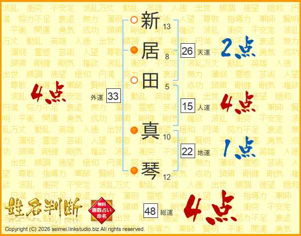 新(13画)居(8画)田(5画) 真(10画)琴(12画)