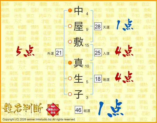中(4画)屋(9画)敷(15画) 真(10画)生(5画)子(3画)