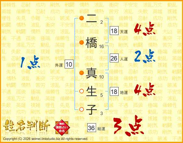 二(2画)橋(16画) 真(10画)生(5画)子(3画)