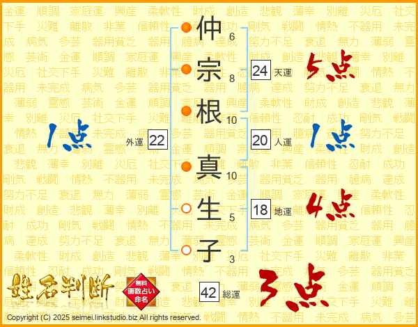 仲(6画)宗(8画)根(10画) 真(10画)生(5画)子(3画)