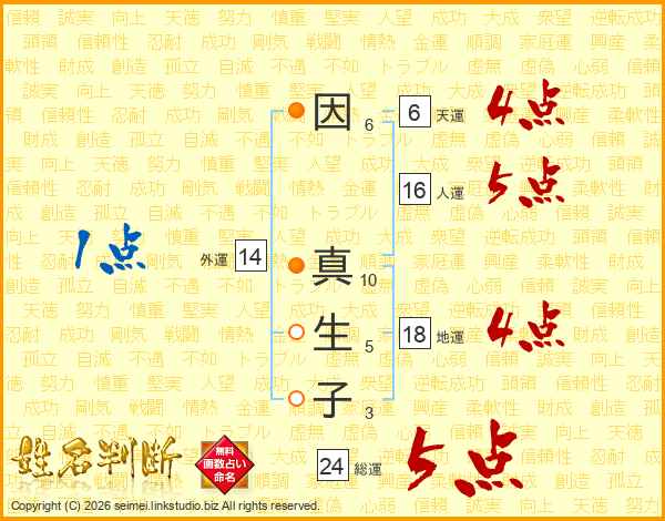 生活面を象徴する運勢です。外部から受ける影響力を表し、結婚運、家庭運や職場、環境への順応性を表します。総運から人運を引いた画数。姓や名が1文字の場合を除く。