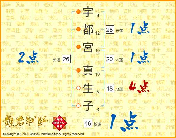 宇都宮真生子さんの総運は46画の1点!