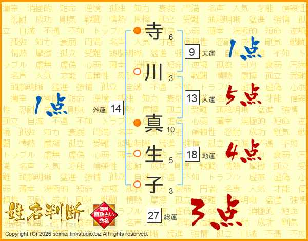 寺(6画)川(3画) 真(10画)生(5画)子(3画)