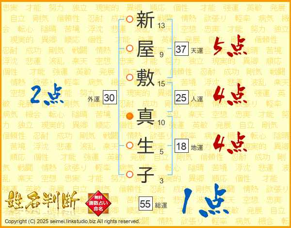 新(13画)屋(9画)敷(15画) 真(10画)生(5画)子(3画)