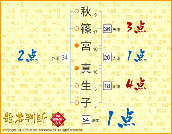 秋(9画)篠(17画)宮(10画) 真(10画)生(5画)子(3画)