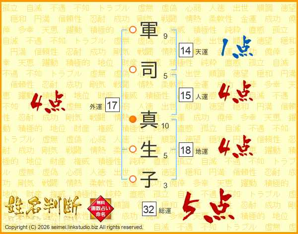 軍(9画)司(5画) 真(10画)生(5画)子(3画)