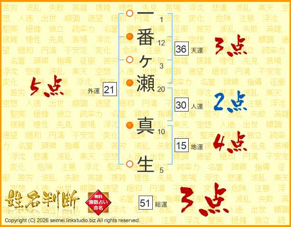 あなたの人生を表す1番重要な運勢です。生涯を通じて影響する総合運となり、主に50歳以降の晩年期に影響を及ぼします。苗字と名前の合計画数。