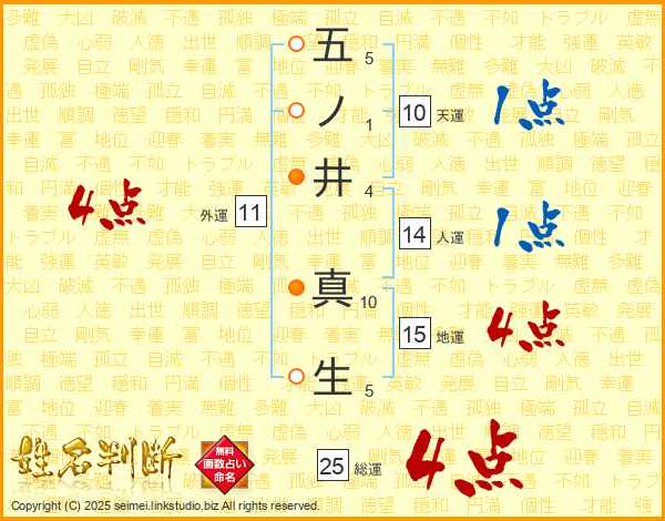 五(5画)ノ(1画)井(4画) 真(10画)生(5画)