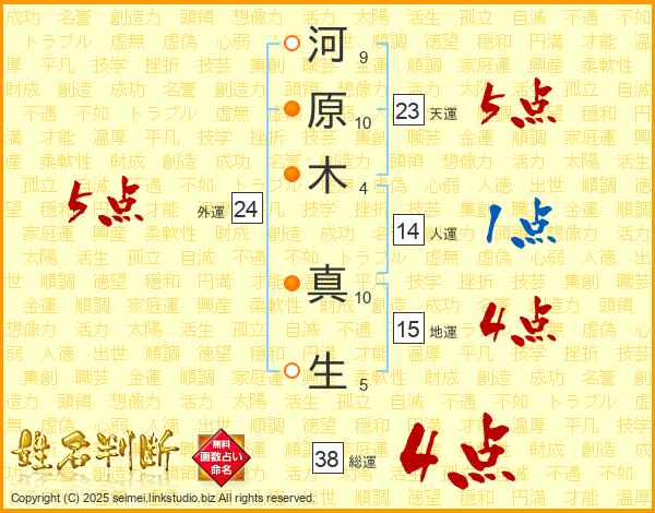 河(9画)原(10画)木(4画) 真(10画)生(5画)
