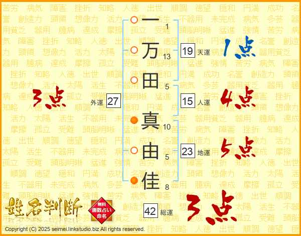 一(1画)万(13画)田(5画) 真(10画)由(5画)佳(8画)