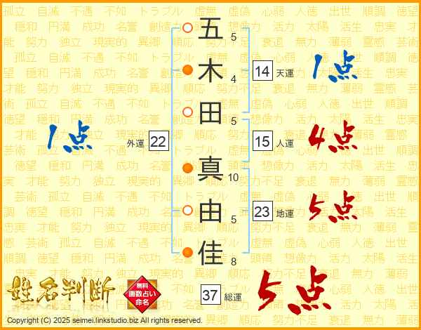 五(5画)木(4画)田(5画) 真(10画)由(5画)佳(8画)