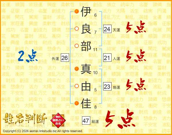 伊(6画)良(7画)部(11画) 真(10画)由(5画)佳(8画)