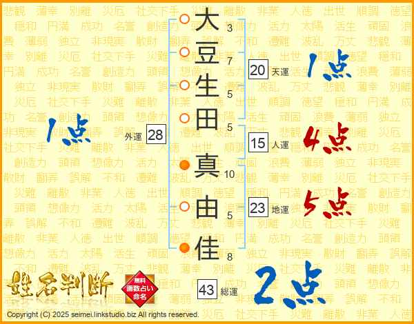 大(3画)豆(7画)生(5画)田(5画) 真(10画)由(5画)佳(8画)