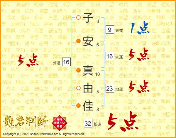 子安真由佳さんの外運は16画の5点!