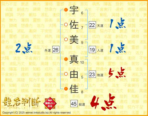 宇(6画)佐(7画)美(9画) 真(10画)由(5画)佳(8画)