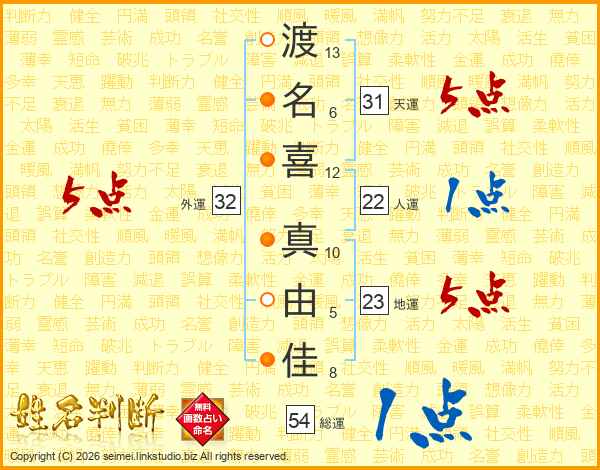 渡(13画)名(6画)喜(12画) 真(10画)由(5画)佳(8画)