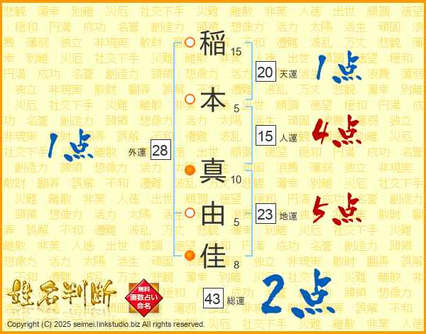 稲(15画)本(5画) 真(10画)由(5画)佳(8画)
