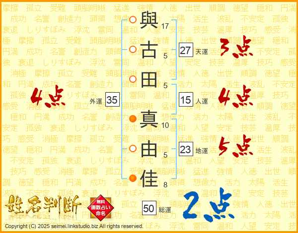 與(17画)古(5画)田(5画) 真(10画)由(5画)佳(8画)