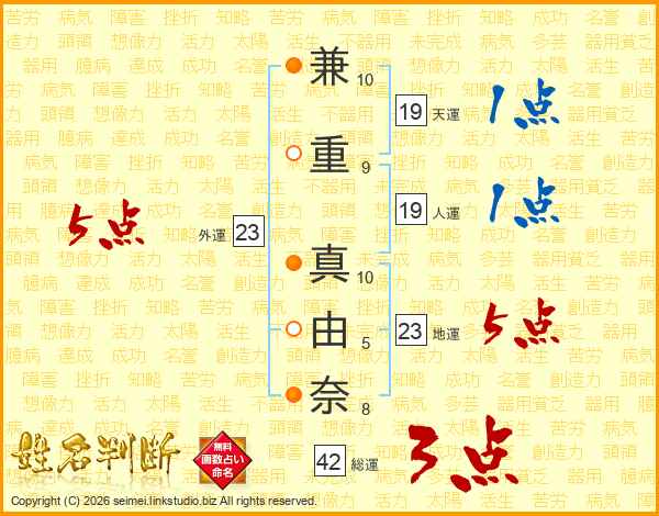兼(10画)重(9画) 真(10画)由(5画)奈(8画)
