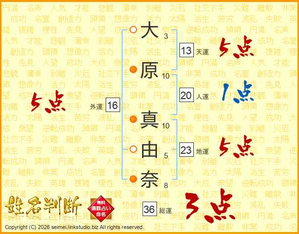 大(3画)原(10画) 真(10画)由(5画)奈(8画)
