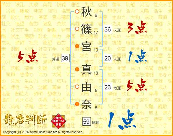 秋(9画)篠(17画)宮(10画) 真(10画)由(5画)奈(8画)