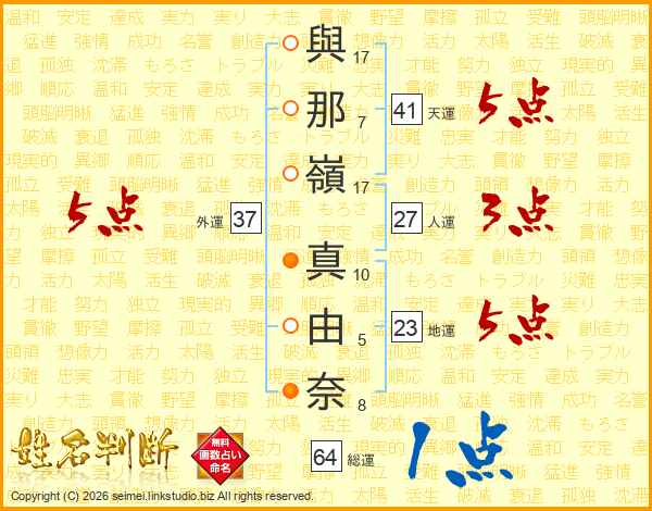與(17画)那(7画)嶺(17画) 真(10画)由(5画)奈(8画)