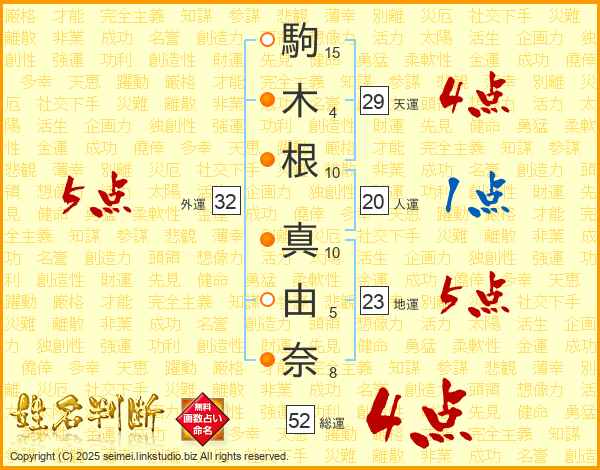 駒(15画)木(4画)根(10画) 真(10画)由(5画)奈(8画)