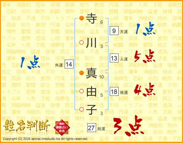 寺(6画)川(3画) 真(10画)由(5画)子(3画)