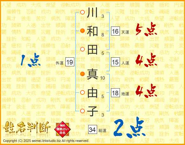 川(3画)和(8画)田(5画) 真(10画)由(5画)子(3画)