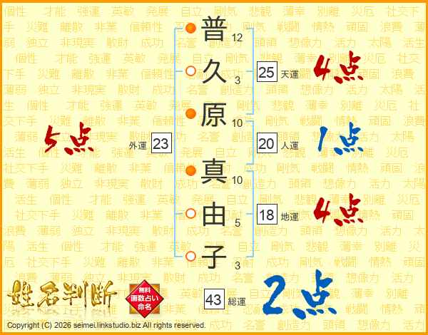 普(12画)久(3画)原(10画) 真(10画)由(5画)子(3画)