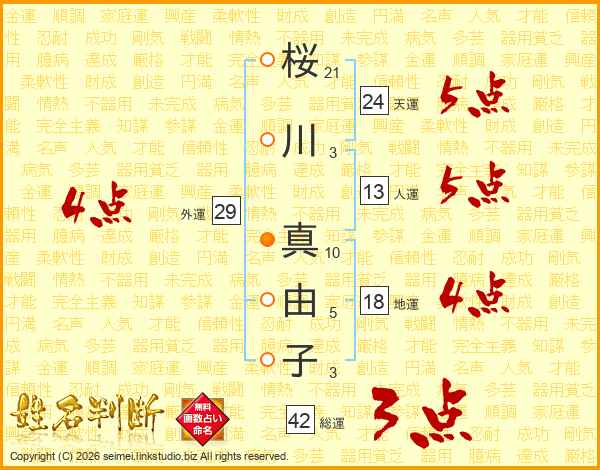 桜(21画)川(3画) 真(10画)由(5画)子(3画)