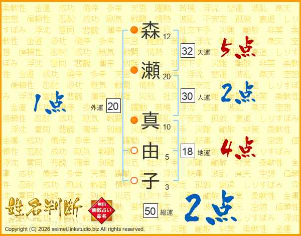 森(12画)瀬(20画) 真(10画)由(5画)子(3画)