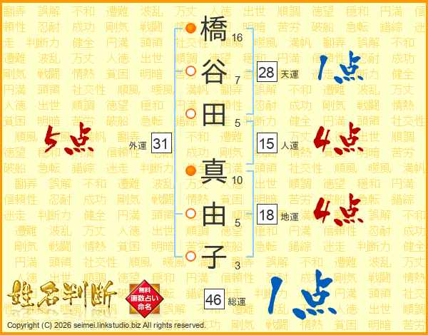 橋(16画)谷(7画)田(5画) 真(10画)由(5画)子(3画)