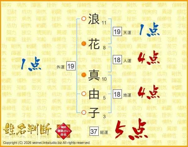浪(11画)花(8画) 真(10画)由(5画)子(3画)