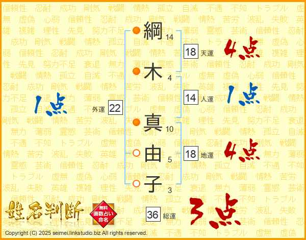 綱(14画)木(4画) 真(10画)由(5画)子(3画)