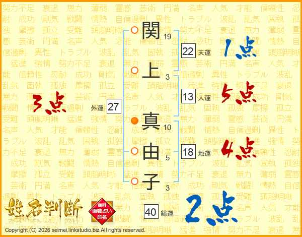 関(19画)上(3画) 真(10画)由(5画)子(3画)
