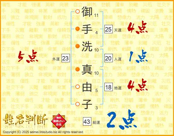 御(11画)手(4画)洗(10画) 真(10画)由(5画)子(3画)