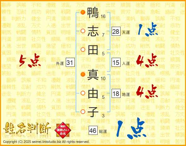 鴨(16画)志(7画)田(5画) 真(10画)由(5画)子(3画)