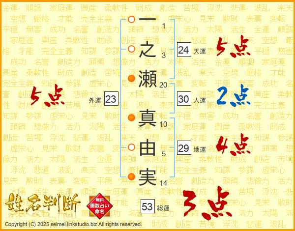 一(1画)之(3画)瀬(20画) 真(10画)由(5画)実(14画)