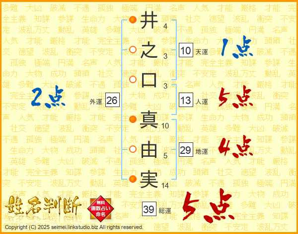 井(4画)之(3画)口(3画) 真(10画)由(5画)実(14画)