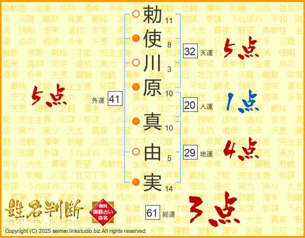 勅(11画)使(8画)川(3画)原(10画) 真(10画)由(5画)実(14画)