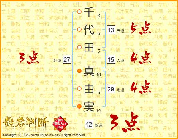 千(3画)代(5画)田(5画) 真(10画)由(5画)実(14画)