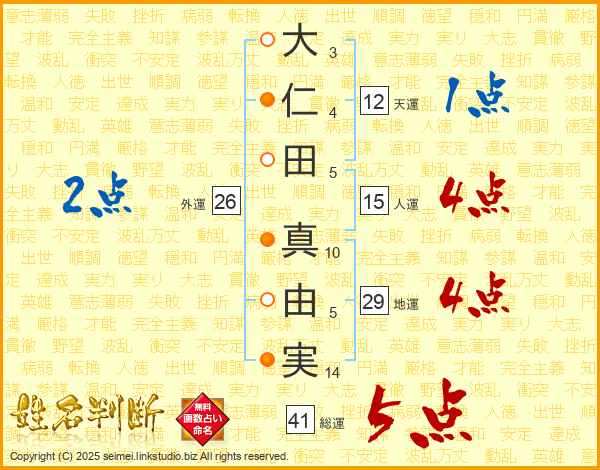 大(3画)仁(4画)田(5画) 真(10画)由(5画)実(14画)