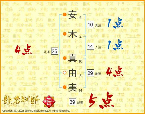 安(6画)木(4画) 真(10画)由(5画)実(14画)