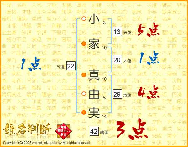 小(3画)家(10画) 真(10画)由(5画)実(14画)