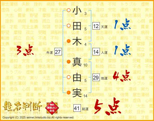小(3画)田(5画)木(4画) 真(10画)由(5画)実(14画)