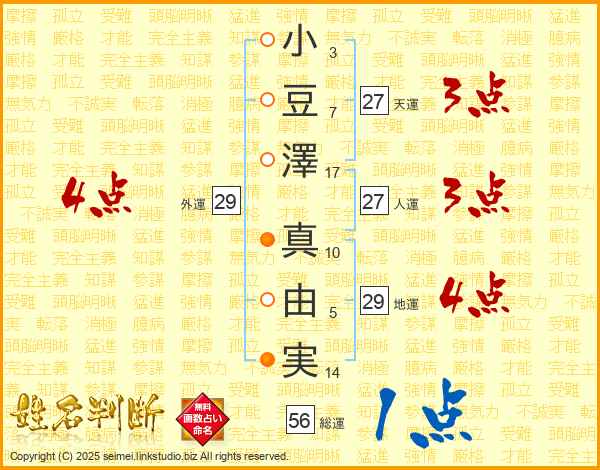 小(3画)豆(7画)澤(17画) 真(10画)由(5画)実(14画)