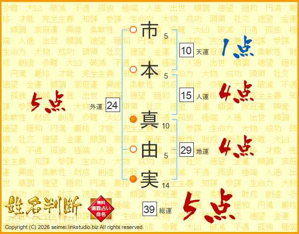 市(5画)本(5画) 真(10画)由(5画)実(14画)